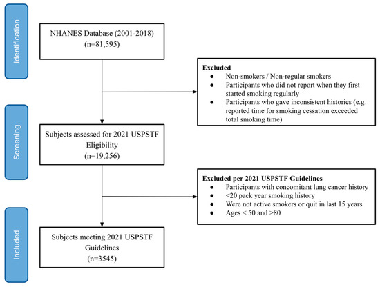 Between these years, a total of 81,595 participants were identified, who were further filtered by the inclusion and exclusion criteria to meet the USPSTF lung screening recommendations. The inclusion criteria were (a) participants aged 50–80 years and (b) smokers with at least a 20 pack-year smoking history who were actively smoking or quit in the last 15 years. Exclusion criteria consisted of participants with (a) a concomitant LC history, (b) ages below 50 and above 80, and (c) inconsistent histories (e.g., reported time for smoking cessation exceeded total smoking time). Out of the initial 81,595 subjects, 3545 participants met the criteria (Figure 1). A breakdown of the 2021 USPSTF-eligible lung cancer screening population characteristics from the NHANES (2001–2018) are detailed in Table 1.