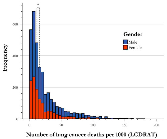 Frequency distribution of risk of lung cancer death by gender. The risk stratification of LC deaths by gender illustrated by frequency of USPSTF-qualified cases of LC deaths per 1000. The central tendency of data for each gender group is established as the median, and is indicated in the figure correlating with group color, with respect to the figure key. The medians of male and female for risk stratification for LC death were found to be significantly different using Mann–Whitney U analysis, as shown using an asterisk (*).