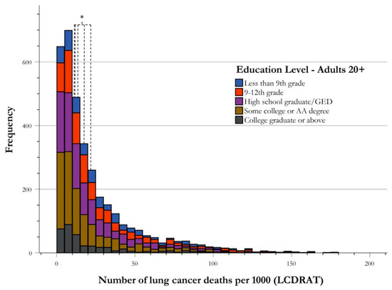 Frequency distribution of risk of lung cancer death by education level. Risk stratification of LC deaths by highest educational attainment level illustrated by frequency of USPSTF-qualified cases of LC deaths per 1000. The central tendency of data for each educational group is established as the median, and is indicated in the figure correlating with group color, with respect to the figure key. The medians of all groups for risk stratification for LC death were found to be significantly different using one-way ANOVA analysis, as shown using an asterisk (*).