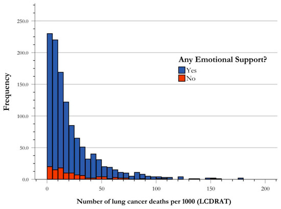 Frequency distribution of risk of lung cancer death by emotional support. Risk stratification of LC deaths by presence or absence of emotional support illustrated by frequency of USPSTF-qualified cases of LC deaths per 1000. The central tendency of data for each emotional support group is established as the median, and is indicated in the figure correlating with group color, with respect to the figure key. The medians of presence and absence of emotional support for risk stratification for LC death were found to not be significantly different using Mann–Whitney U analysis.