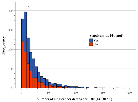 Frequency distribution of risk of lung cancer death by secondhand smoke exposure. Risk stratification of LC deaths by presence of secondhand smoke exposure illustrated by frequency of USPSTF-qualified cases of LC deaths per 1000. The central tendency of data for each group is established as the median, and is indicated in the figure correlating with group color, with respect to the figure key. The medians of all groups for risk stratification for LC death were found to be significantly different using Mann-Whitney U analysis as shown using an asterisk (*).