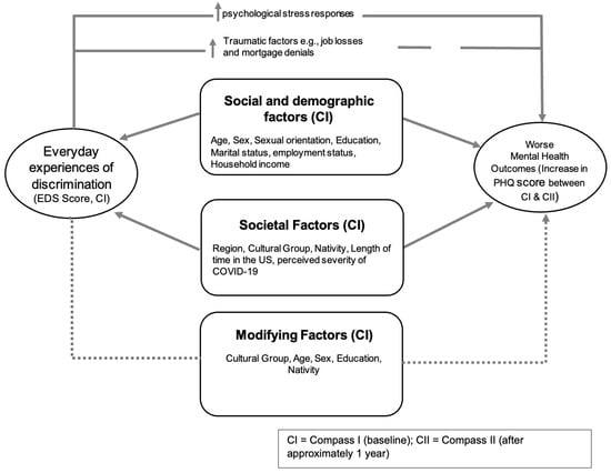 This study’s measurement framework, guided by the previously discussed literature and the National Institute of Minority Health and Health Disparities (NIMHD) Research Framework [], examined multi-level influences on discrimination experiences, which operate within the sociodemographic contexts of AANHPIs (e.g., cultural group, age, sex, sexual orientation, education, income, English proficiency, nativity, years in the US) that cut across individual, interpersonal (marital status, employment status), and community (geographic regions, perceived severity of COVID-19) levels that are modifiable and COVID-specific. A conceptual framework that describes the inter-relatedness of these variables in relation to mental health is shown in Figure 1 below. As depicted, everyday experiences of discrimination can impact mental health outcomes either through increased physiological stress responses or through the presence of more traumatic factors such as job losses or mortgage denials. In addition, societal factors and sociodemographic factors may affect or modify this association.