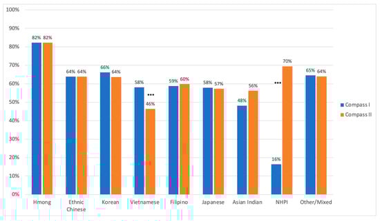 Over the approximately 1-year period, reported experiences of discrimination remained high in the group, with 60.6% reporting any experiences of discrimination in COMPASS I, compared with 60.2% among the same population in COMPASS II. Within subgroups, experiences were higher for Asian Indians, and Native Hawaiian and Pacific Islanders, while lower for Vietnamese, although the difference was statistically significant only for NHPIs and Vietnamese. The reported experiences were similar for ethnic Chinese, Hmong, and Filipino participants (Figure 2).