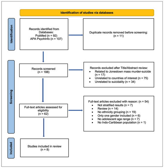 Records containing abstracts focusing on the Jonestown massacre were excluded, since the majority of the victims were American citizens, which would be unrepresentative of general Guyanese demographics [9]. Also excluded via screening were studies not focusing on Guyana, Suriname, or Trinidad and Tobago, since the aforementioned countries are the focus of the current study. Lastly, abstracts not mentioning suicidality were also excluded during screening.