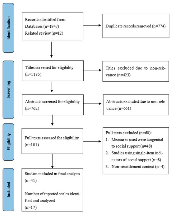A total of 1185 titles of articles were screened for relevance in Zotero, and 423 were excluded for non-relevance. A total of 762 abstracts were then screened for eligibility, of which 661 were excluded for not including a quantitative measure of social support. A full-text review was conducted in 101 articles; of this number, 48 articles used instruments tangential to social support; 8 articles used individual indicators of social support; and 4 articles did not include refugees in resettlement contexts, resulting in the removal of 60 articles. We retained 41 articles in the final analysis, from which we identified a total of 17 distinct social support instruments used in research with resettled refugees, which form the basis for our review and analysis (Figure 1). Having identified the 17 social support instruments used in research with resettled refugees, we then searched for the full-length instruments and articles that described their original development and psychometric properties.