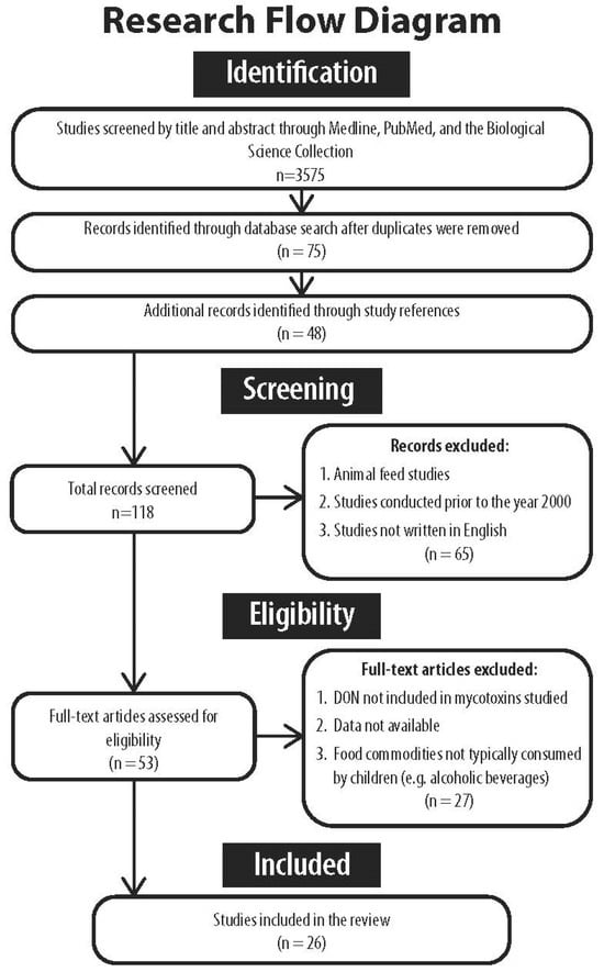 Occurrences and incidences of DON contamination globally in raw, cooked, baked, processed, and unprocessed foods were sought. In total, 3575 titles and abstracts were initially screened. Studies showing infection occurrence anywhere from farm to storage to table were included. Only those that assessed contaminated foods for human consumption were included. The literature was also assessed for the quality of methods, and only studies that used validated and reliable testing methods (e.g., lateral flow screening or liquid chromatography combined with mass spectrometry–mass spectrometry (LC-MS/MS)), random sampling, and adequate control procedures to limit bias were included. Surveys and analyses of cereals and other commodities intended for animal feed were excluded, as more permissive regulatory guidelines apply to these commodities (e.g., 5000 µg/kg for swine versus 1000 µg/kg for human consumption) []. Studies not written in English were also excluded. In total, 118 studies were initially reviewed. The Preferred Reporting Items for Systematic Reviews and Meta-Analysis (PRISMA) diagram in Figure 1 displays the flow of research selection for crop contamination rates. Ultimately, one comprehensive systematic review covering global contamination incidences from 2008 to 2019, and 25 other original studies identifying DON, its acetylated metabolites, and other trichothecene mycotoxins, were reviewed for crop contamination rates. DON occurrence and detected levels were evaluated against the currently established PMTDI intake levels.