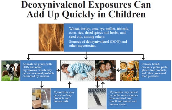 Numerous nutritional strategies have been developed by healthcare professionals aimed at improving child health and decreasing foodborne illness. However, mycotoxins rarely find their way into healthcare discussions unless a large outbreak of mycotoxicosis is discovered only after other pathogens are ruled out. Instead, mycotoxins have been studied for pharmaceutical purposes. Indeed, many mold-borne secondary metabolites have been used to create medications, including penicillin, cyclosporin, and statins, among many other life-saving medicines []. Regardless, mycotoxins such as DON have no medicinal purpose and can cause considerable illness after repeated exposure to contaminated food [,].