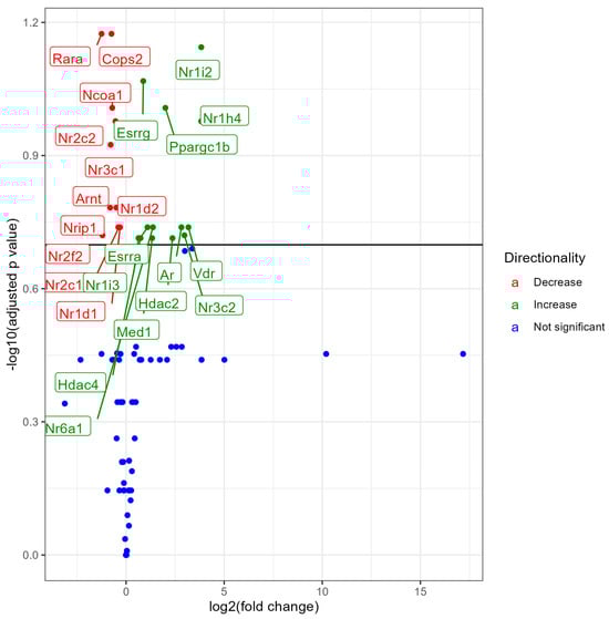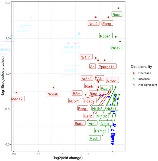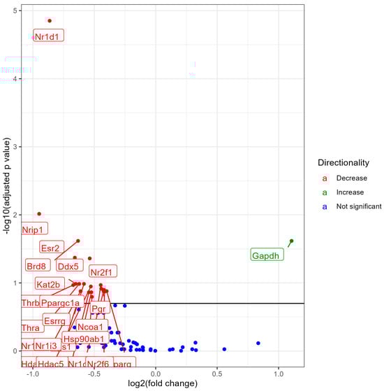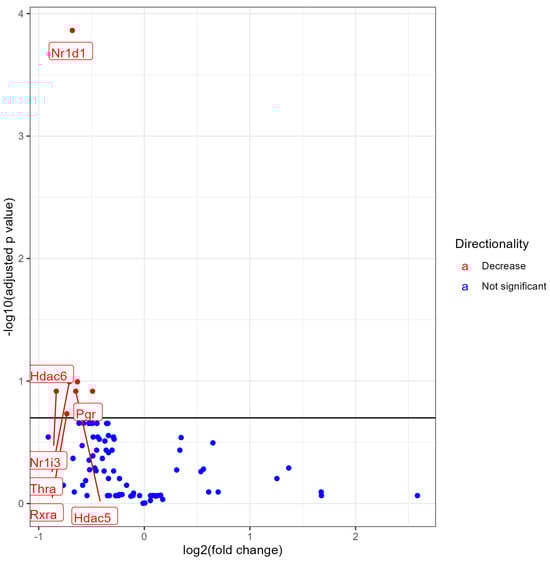Female mice exposed to 3% nicotine e-liquid aerosols when compared with female mice exposed to 0% nicotine (no nicotine) e-liquid aerosols showed the significant downregulation of seven NRs, namely, Nr1d1, Hra, Hdac6, Nr1i3, Pgr, Hdac5, and Rxra, and no upregulation at an FDR < 0.2 (Figure 4). A list of all significantly modulated NRs along with the fold change, p values, and FDR values is provided in the Supplementary Materials (Table S4).