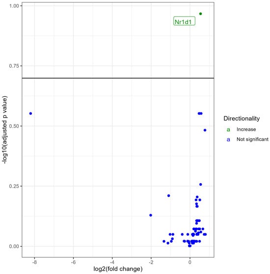 Female mice exposed to 0% nicotine aerosols when compared with control female mice (no treatment) showed the significant upregulation of only 1 NR and no downregulated NRs at an FDR < 0.2 (Figure 2). We observed upregulation of Nr1d1. The fold change values, p values, and FDR values are provided in the Supplementary Materials (Table S2).