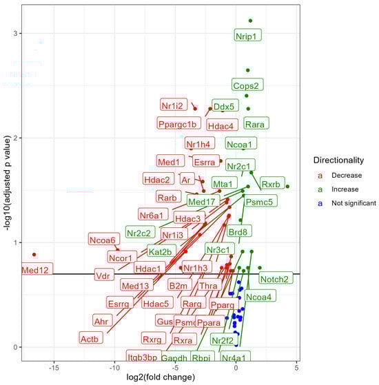 Male mice exposed to 3% nicotine e-liquid aerosols when compared with male mice exposed to 0% nicotine (no nicotine) e-liquid aerosols showed the differential expression of 53 NRs, out of which 20 NRs showed upregulation and 33 NRs showed downregulation at an FDR < 0.2 (Figure 3). The upregulation of Nrip1, Cops2, Ddx5, Rara, Ncoa1,Mta, Nr2c1, Psmc5, Rxrb, Med17, Nr2c2, Kat2b, Nr3c1, Brd8, Nr4a1, Gapdh, Notch2, Rbpj, Ncoa4, and Nr2f2, and downregulation of Nr1i2, ppargc1b, Hdac4, Nr1h4, Esrra, Med1, Hdac2, Nr6a1, Ar, Rarb, Hdac3, Nr1i3, Esrrg, Vdr, Hdac5,Ncor1, Nr1h3, hdac1, Med13, Gusb, AhR, Ncoa6, Actb, Med12, Thra, Rxrg, Rxra, Itgb3bp, Psmc3, Rarg, Pparg, and Ppara indicate a significant effect of nicotine in e-liquid. A list of all significantly modulated NRs along with the fold change, p values, and FDR is provided in the Supplement (Table S3).