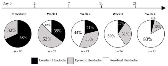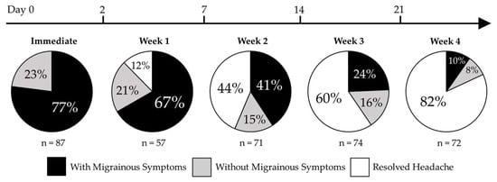 A similar transition of the association of headaches with and without migrainous symptoms also occurred in a number of individual patients prior to headache resolution. An amount of 32% of patients (n = 28/87) transitioned from headaches associated with migrainous symptoms to headaches without associated migrainous symptoms. An amount of 46% of patients (n = 40/87) experienced only headaches associated with migrainous symptoms. An amount of 22% of patients (n = 19/87) experienced only headaches without associated migrainous symptoms.