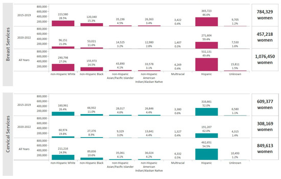 Total number of women that received breast and cervical cancer screenings through the NBCCEDP during 2015–2022 by race/ethnicity. The dark pink bars represent breast cancer screening volume and the light blue bars represent cervical cancer screening volume.
