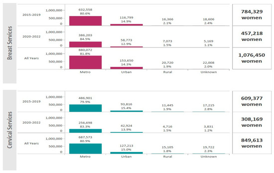 For the period January 2015–December 2022, the NBCCEDP provided 1,721,804 mammograms and 1,632,693 Pap tests and/or HPV tests. A total of 1,076,450 women received breast cancer screening and 849,613 women received cervical cancer screening services (Figure 1). Hispanic women comprised 49.4% of breast cancer screenings and 54.5% of cervical cancer screenings (Figure 1). The majority of women receiving breast and cervical cancer screening lived in metro areas (81.8% and 80.9%, respectively) (Figure 2).
