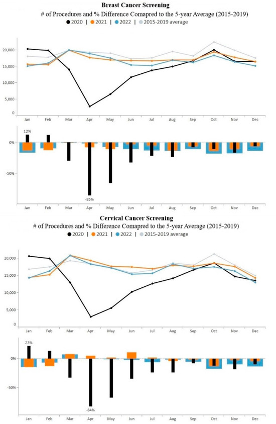 Another observed pattern from the study involves declines in both breast and cervical cancer screening volumes in the second half of 2022. Following the dramatic decline in March and April 2020, both breast and cervical cancer screening volumes steadily increased from April to October 2020 and remained relatively stable throughout 2021. However, from June to December 2022, monthly volumes fell below 2021 monthly screening volumes, as well as below the pre-COVID-19 pandemic averages. These declines may be a consequence of increased COVID-19 community levels in the US during 2022 [26,27,28] and related fear of COVID-19 exposure [29,30]. The maximum COVID-19 test percent positivity in 2020 was 15.7%, and in 2021 it was 14.4% [27]. However, the maximum COVID-19 test percent positivity in 2022 was 30.2% [27]. Although there are currently no data describing the relationship between yearly changes in COVID-19 community levels and fear of COVID-19 during 2020–2022, early findings suggest that patient fear of contracting COVID-19 negatively impacted providers’ ability to perform cancer screenings for breast and cervical cancer [29,30].