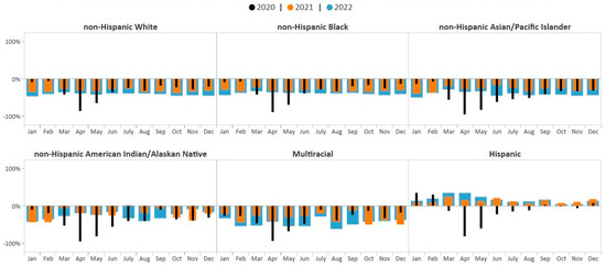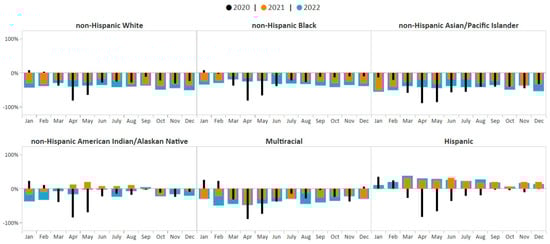 Monthly NBCCEDP breast cancer screening tests for January 2020 through December 2022 compared with the 5-year average, 2015–2019, by race/ethnicity. The grey line represents average screening tests conducted over the 5-year period, 2015–2019. Black histograms represent screening tests conducted in 2020; orange histograms represent screening tests conducted in 2021; blue histograms represent screening tests conducted in 2022. Histograms above the 0% line represent monthly screening volumes that have increased by various percentage points compared to the 5-year averages (2015–2019); those below the 0% line represent monthly screening volumes that have decreased by various percentage points compared to the 5-year averages (2015–2019).
