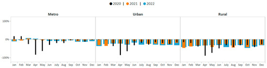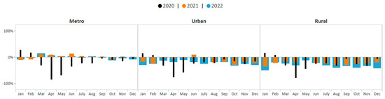 One-way ANOVA test results suggest that the average monthly percent change in breast cancer screening volume was statically significantly different across rurality groups during January 2020–December 2022 (F (2, 93) = 57.64; p < 0.0001). The Student–Newman–Keuls test suggests that average monthly screening volume among metro, rural, and urban areas were all significantly different from each other during this period (p < 0.05). The average monthly breast cancer screening volume among women in metro areas showed the smallest deficit (−8.8%, p < 0.05). Breast cancer screening volume in metro areas improved from 85% below the five-year average in April 2020 to only 2% below the five-year average by December 2021 (Figure 6). Consistent with the aggregate data, breast cancer screening volume among women in metro areas then declined slightly in 2022 yet remained closer to pre-COVID-19 pandemic averages compared to screening volume in urban and rural areas. The average monthly breast cancer screening volume among women in urban areas showed the second greatest deficit (−26.1%), p-value < 0.05. Breast cancer screening volume among women living in urban areas remained below pre-COVID-19 pandemic averages during each month of 2021–2022; however, monthly deficits were not as great as those observed among women living in rural areas. The average monthly breast cancer screening volume among women in rural areas showed the greatest deficit (−37.3%, p < 0.05). Breast cancer screening volume among women living in rural areas also remained below pre-COVID-19 pandemic averages during each month of 2021–2022. By December 2022, breast cancer screening volume was below pre-COVID-19 pandemic averages by 33%.