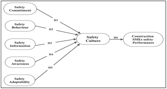 Safety awareness is the ability of employees to judge and identify dangers in purposeful production activities [59]. Awareness of an unsafe factor is what the human brain has on objective existence [60]. The unsafe behaviour of employees, the unsafe state of things, and the environmental response to hazardous conditions may be attributed to a poor safety culture. The commitment to the health and safety of construction SMEs depends on the level of awareness of employees of health and safety [61,62]. A low level of safety awareness implies a negative safety culture. Within a positive safety culture, workers usually develop an awareness of site safety, recognising that safety is paramount in every activity they undertake [63]. Safety awareness measures how well the management and staff of construction SMEs are aware of the risks to their safety and the safety of others related to business operations. Safety awareness allows employees to recognise a wide range of hazards and the effects of individual actions in the workplace, eliminating job-induced risks [64]. The study hypothesises that safety awareness in the safety culture will significantly influence SMEs’ construction.