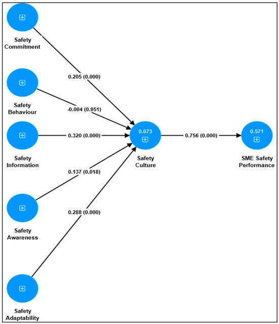 As presented in Table 4, the results demonstrated no multi-collinearity concerns, as all the Variance Inflation Factor (VIF) values were below 3, ranging from 1.000 to 2.765 [89]. Furthermore, the structural framework exhibited a good fit, as the Standardized Root Mean Squared residual (SRMR) values were less than 0.08 [90]. The R2 values revealed that the structural model explained 57.1% and 67.3% of the variation in safety performance and safety culture, respectively. Thus, the model demonstrated substantial explanatory power in predicting safety performance and safety culture [89].