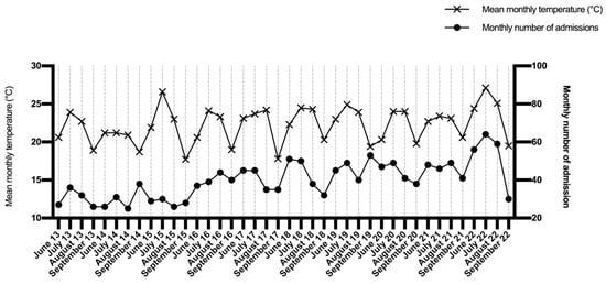 The present study is a descriptive, cross-sectional study. Data on mean monthly temperatures and on admissions to our clinic were collected retrospectively for the summer months of a 10 year period. The study included data from all patients admitted during the observation period to the acute psychiatric unit of San Luigi Gonzaga University Hospital in Orbassano, Turin, Italy. The total observation period was 40 months, i.e., the months from June to September of the years from 2013 to 2022. The data collection and analyses for the present study were conducted with the approval of the local Ethics Committee (Comitato Etico Interaziendale San Luigi Gonzaga; approval code: 7119/Tit:02/Cat:06).