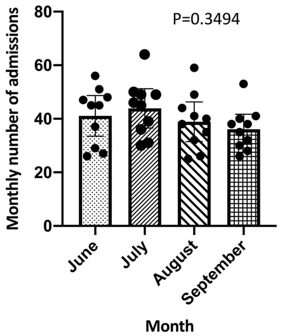 The mean numbers of admissions for each month of any year are reported in Figure 2. No significant difference was observed between the mean numbers of admissions for each month (p = 0.3494) (Figure 2).