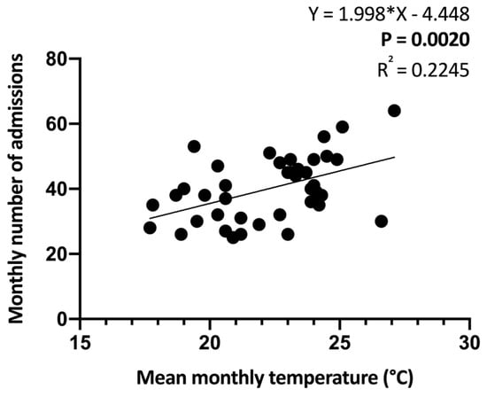 We performed a linear regression analysis, setting the mean monthly temperature as the independent variable and monthly number of admissions as the dependent variable. The regression coefficient was 1.998 (95% Confidence Interval (CI) 0.7785 to 3.218, p = 0.0020), and the Pearson correlation coefficient (R2) was 0.2245 (Figure 3).
