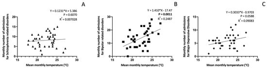 Linear regression analyses between mean monthly temperature and monthly number of admissions for schizophrenia (A), Bipolar Disorder (B), and major depressive disorder (C).