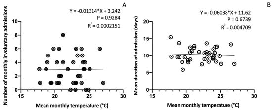Linear regression analysis between mean monthly temperature and monthly number of involuntary admissions (A) and mean duration of admission (B).