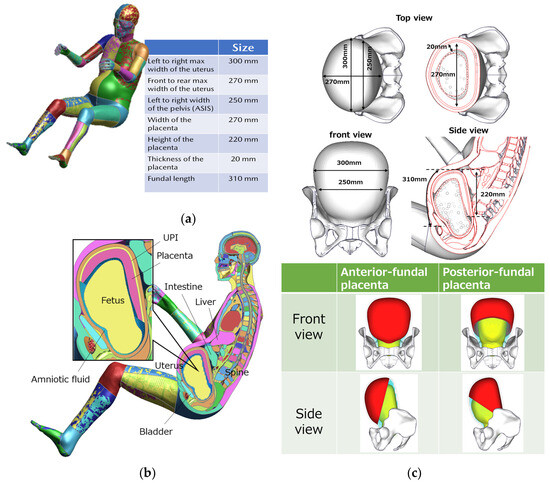 (a) The measurement data of the uterus and placenta; (b) the pregnant occupant model; (c) the position of the placenta in the uterus.