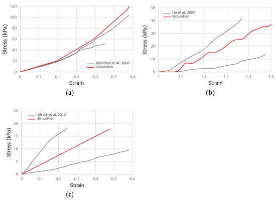 The property of the uterus was defined with reference to the S-S properties in tissue tensile tests (Figure 2a) [22]. The properties of the placenta and UPI were defined based on the literature data reported by Hu et al. and Klinich et al. [23,24,25] (Figure 2b,c). Other properties of tissues around the uterus were defined with the literature data reported by Moorcroft et al. [14].