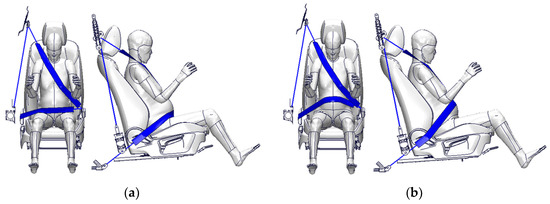 A survey on the seatbelt usage of 680 pregnant drivers reported that 87% of them used seatbelts appropriately, namely avoiding the abdominal protrusion and positioning on the iliac wings, while 13% used seatbelts in other ways in Shiga Prefecture, Japan [26]. Additionally, the most popular uses of a seatbelt in other ways were to fasten a lap-belt over the abdominal protrusion, and this type accounted for a low rate of pregnant drivers [27]. Considering these data, two types were selected as the method for fastening a seatbelt in FE simulations: a lap-belt position on the iliac wings (proper position, Figure 3a) and over the abdominal protrusion (Figure 3b).