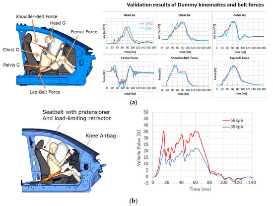 In this study, vehicle models used in simulation were based on Mazda’s typical specification, and the 6 DOF accelerations were applied to the vehicle body about its center of gravity (COG) in order to simulate the vehicle kinematics. The acceleration data were obtained from an in-house crash test. The validation results of the simulation model with the Hybrid III AM50 dummy are shown in Figure 4a. The pregnant model was placed in the driver seat and constrained by a seatbelt with a pretensioner and load-limiting retractor without a dynamic locking tongue (Figure 4b). The simulations were conducted with vehicle pulse in a 56 kph and 35 kph full-frontal crash. The models with two types of utero-placental models, the anterior- or posterior-fundal placenta, were used, and the seatbelt was fitted on the chest and lower abdomen or across the abdomen, respectively (Figure 3). Additionally, the occupant was constrained by a knee airbag deployed from the instrumental panel. The seat cushion was squashed to consider the initial compression by gravity. The simplified seating method implemented in Oasys PRIMERTM was used.