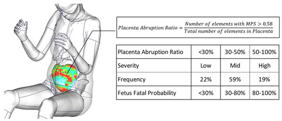 A method for evaluating the area of placental abruption on the pregnant model was developed. In engineering, strain refers to the deformation such as tension, contraction and twisting that occurs when an external force is applied to an object. Placental abruption is thought to be caused due to localized tensile forces during a seatbelt loading, resulting in the deformation of the uterus and placenta. Therefore, in this study, the threshold for placental abruption in the placenta was defined as the maximum principal strain of 0.58 based on the previous literature [3], and the ratio of the area of placental elements exceeding the value to the total placental elements was calculated. This ratio was compared with the severity of placental abruption used in clinical practice to assess the severity of the injury and fetal outcomes (Figure 5).