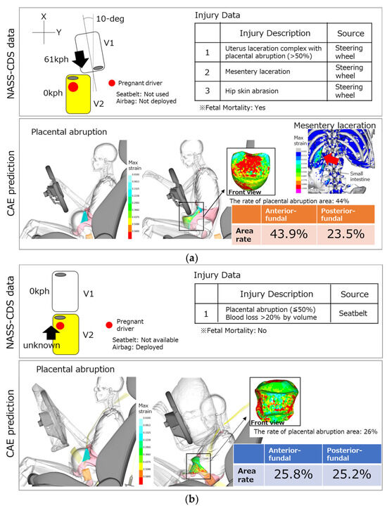 The validation results of the pregnant models with NASS-CDS: (a) Case ID 437009969; (b) Case ID 777012267.