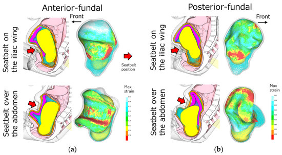 The analysis results of the lap-belt positions (on the iliac wings or over the abdomen) for the placental positions: (a) anterior-fundal placenta and (b) posterior-fundal placenta. Red arrows show the position of the seatbelt loading during a collision.