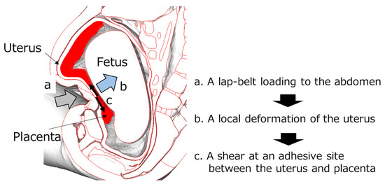 From the analysis using the graphs of Figure 10 and simulations of occupant kinematics, lap-belt loading to the abdomen was observed due to the forward displacement of the pregnant occupant at 60 ms. After this, with a slight delay, the maximum rate of 9.4% placental abruption was confirmed at 70 ms. Based on the above results, one hypothesis was proposed as the mechanism of placental abruption: a shear at adhesive sites between the uterus and placenta due to the local deformation of the uterus resulting from the lap-belt loading to the abdomen (Figure 11). Rupp et al. and Motozawa et al. previously proposed this hypothesis [3,11], and its probability was confirmed in this study. Further verifying this hypothesis would be needed by analyzing the severity of placental abruption on various collision types and speeds, occupant restraints, seat positions and seating postures.