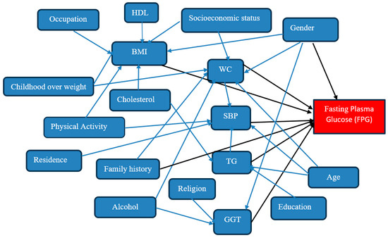 At the 5% significance level, BMI and TG were the dominant predictors of diabetes, with all variables, except WC, demonstrating significant direct associations with FPG. Female sex and a family history of diabetes also directly influenced FPG levels, whereas childhood overweight, family history of diabetes, and female sex increased the predictive pathways involving WC and BMI. Sociodemographic factors such as age, socioeconomic status, and occupation also played an indirect role in affecting FPG levels through WC and BMI. Physical activity appears to have a negative impact on FPG levels, implying a protective effect.