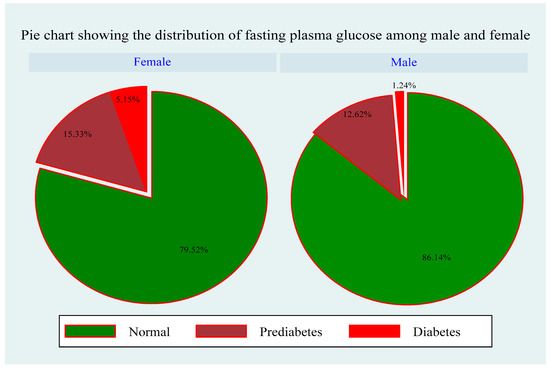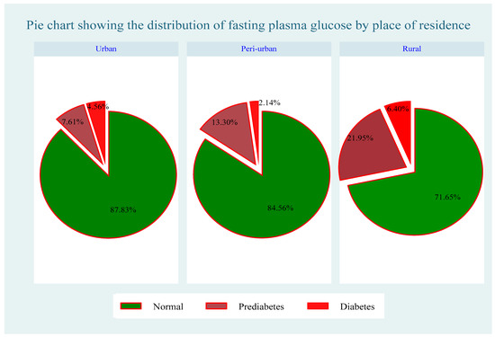 A total of 1200 participants were included in this study. Of these, 981 (81.75%) had normal fasting plasma glucose levels, 173 (14.2%) had prediabetes, and 46 (3.83%) had diabetes (Table 1). As shown in Figure 2, a higher prevalence of both prediabetes and diabetes was observed among females than among males, with 122 (15.33%) females having prediabetes, 41 (5.15%) females diagnosed with diabetes, and 633 (79.52%) females displaying normal fasting plasma glucose levels. Among males, only 51 (12.62%) had prediabetes, 5 (1.24%) had diabetes, and 348 (86.14%) had normal fasting plasma glucose levels. Moreover, this study found disparities in the prevalence of undiagnosed diabetes across rural, peri-urban, and urban areas. In rural areas, 21.95% were diagnosed with prediabetes, 6.40% had diabetes, and 71.61% had normal glucose levels. In the peri-urban areas, 13.30% had prediabetes, 2.14% had diabetes, and 84.56% had normal fasting plasma glucose levels. In urban areas, 87.61% of participants had normal fasting plasma glucose levels, 7.61% had prediabetes, and 4.56% had undiagnosed diabetes. These findings indicate that the prevalence of undiagnosed diabetes remains high among rural populations, as shown in Figure 2, Figure 3 and Figure 4.