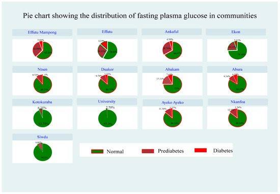 Fasting plasma glucose levels indicated varied prevalence rates for diabetes and prediabetes among the 13 communities within the Cape Coast Metropolis. Effutu had the highest prevalence of diabetes (12.90%) followed by Abakam (7.69%), Abura (6.59%), and Effutu Mampong (5.56%). Effutu Mampong also had the highest prediabetes prevalence (32.08%), followed by Effutu (29.03%), Ankaful (28.74%), and Ekon (20.31%). Notably, participants from the University Cape Coast Campus, Kotokuraba, and Siwdu had the lowest prevalence rates of both diabetes and prediabetes, whereas normal fasting plasma glucose levels varied across communities, with detailed trends shown in the Figures.