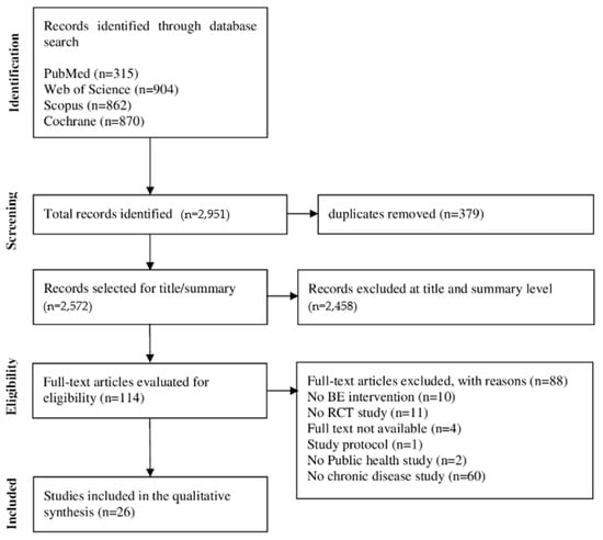The systematic search of the databases identified 2951 articles, and excluded 379 duplicates and removed 2458 articles after analyzing titles and abstracts that did not meet the PICOS strategy described in the study protocol. Due to the use of a broad search strategy in the databases and the use of Randomized Controlled Trials (RCTs), the number of exclusions was significant at this stage of the screening. A sample of 114 articles was identified for full reading, and 88 articles were excluded. The flowchart for this systematic review is shown in Figure 1.