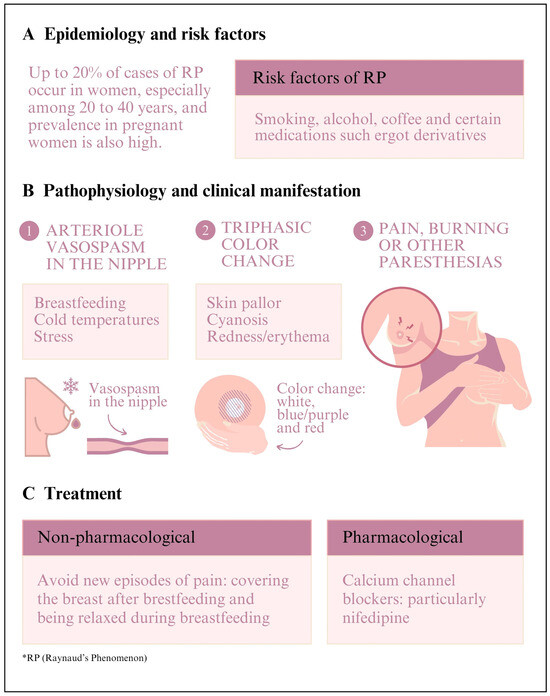 Raynaud’s phenomenon of the nipple: epidemiology, risk factors, pathophysiology, clinical manifestation, and treatment [1,2,3,4,5,6,7,8,9,10,11,12,13,14,15,16,17,18,19,20,21,22,23,24,25,26,27,28,29,30,31,32,33,34,35,36,37,38] (Adapted).