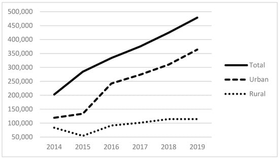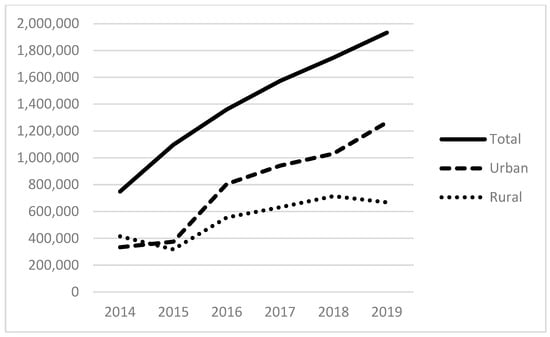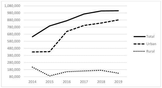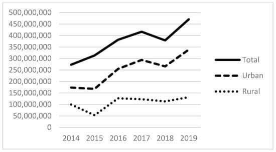 Figure 5, Figure 6 and Figure 7 show the total amount of funding by funding source for the years under study (2014–2019). The HCH program provided nearly USD 300 million in 2019, with the majority of funds going to programs located in urban areas. Total state and local grants and contracts to FQHCs totaled USD 600 million in 2019. State and local funding specifically for indigent care totaled more than USD 400 million in 2019.