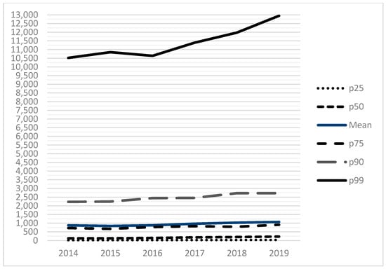 Table 1 (below) presents a descriptive summary of all variables for 2019. The average number of homeless patients served was 1125, with a median of 239. This suggests the importance of a few large providers for the provision of care, evidenced also by looking at the 75th and 90th percentiles. Figure 1 and Figure 2 below display the total number of patients served by all FQHCs from 2014 to 2019 (Figure 1) and the percentile distribution of these homeless service populations (Figure 2). These demonstrate the growth in the total size of the FQHCs’ reported collective homeless service population, from 644 K in 2014 to over 1 M in 2019 (Figure 1). Figure 2 demonstrates that the vast majority of this service occurs in the top quartile of FQHCS. For example, in 2019, an organization in the 99th percentile served nearly 13,000 homeless patients compared to nearly 3000 for the 75th percentile and about 1000 for the 50th or median percentile. This demonstrates that the group of organizations in the top quartile (75th percentile and above) serve the vast majority of homeless patients and are essential to these services. We also examine the total expenses of FQHCs, finding the mean total expenses were USD 30.6 M in 2019. At the county level, the sample is distributed across 545 counties with an average of about 357,000 people per county and a median of about 117,900 people; on average, 14% of the population in a county are in poverty, and 11% who are under 65 have no health insurance; there are typically few community mental health centers within our sample counties, with an average of less than one (0.14), a median of zero, and a maximum of 14. The majority of the counties are full or partial mental health shortage areas.