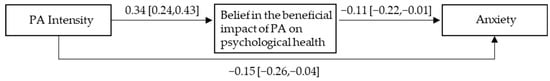 As expected, the mediation analysis reveals a significant negative direct effect of PA intensity on anxiety, suggesting that increased PA intensity predicts lower levels of anxiety (b = −0.15 [−0.26,−0.04]). In addition, the indirect effect of PA intensity on anxiety, mediated by the belief in the beneficial effect of PA on psychological health, was also statistically significant (b = −0.04 [−0.08,−0.01]). Specifically, PA intensity was positively related to belief in the beneficial effect of PA, which was, in turn, negatively associated with anxiety.