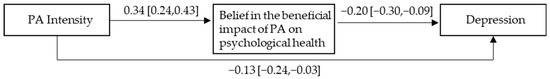 Next, we repeated the mediation analysis to investigate the mediating role of belief in the beneficial effect of PA on psychological health in the relationship between PA intensity and depression (Figure 2).