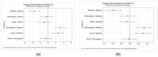 Tukey comparisons between conditions: Standing task (a) REBA scores; sitting task (b) RULA scores.