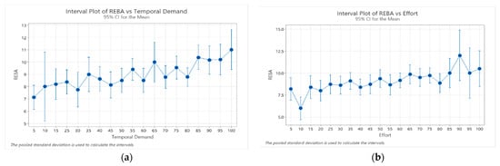Relationship between REBA scores and temporal demand scores (a), and effort scores (b).