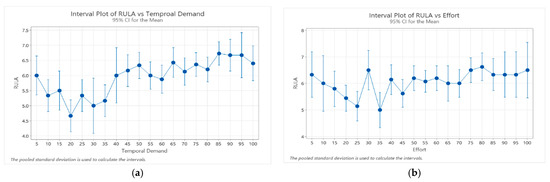 Relationship between RULA scores and temporal demand scores (a), and effort scores (b).