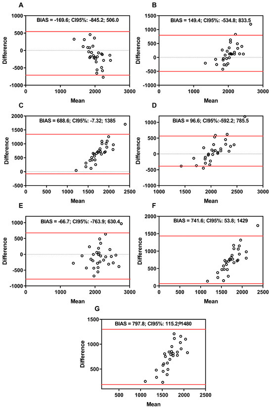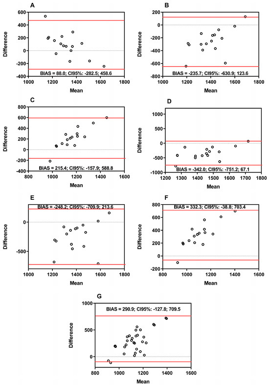 Figure 1 shows the plots of the RMR of CT men (CM). The CM values were as follows: (A) IC and BIA: BIAS = −169.6, SD = 344.7, CI upper = −845.2, CI lower = 506.0; (B) IC and Harris and Benedict: BIAS = 149.4, SD = 349.0, CI upper = −534.8, CI lower = 833.5; (C) IC and Cunningham: BIAS = 688.6, SD = 355.1, CI upper = −7.325, CI lower = 1385; (D) IC and De Lorenzo: BIAS = 96.6, SD = 351.4, CI upper = −592.2, CI lower = 785.5; (E) IC and Tinsley (a): BIAS = −66.7, SD = 355.7, CI upper = −763.9, CI lower = 630.4; (F) IC and Tinsley (b): BIAS = 741.6, SD = 350.9, CI upper = 53.8, CI lower = 1429; (G) IC and Johnstone: BIAS = 797.8, SD = 348.3, CI upper = 115.2, CI lower = 1480.