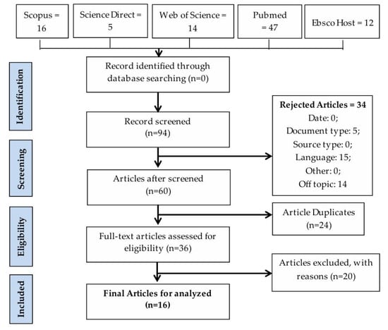 The literature search was conducted up to a publication date of June 2024 in the databases of Scopus, Science Direct, Web of Science, Pubmed, and Ebsco Host. The search returned 16, 5, 14, 47, and 12 documents containing the searched keyword (Figure 1). We eliminated duplicate results, opinion articles, conference proceedings, and review articles. Then, irrelevant articles were eliminated through abstract reading and full-text scanning. Also removed were studies unrelated to occupational noise control on ships. A total of 16 articles were reviewed to examine noise control strategies on ships.