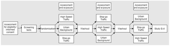 Due to the complexity of multipollutant aerosol mixtures within exhaust and NEEs, we will utilise an efficient randomised cross-over semi-experimental design investigating short-term respiratory health impacts in non-smoking adults with mild–moderate asthma during and after sequential standardised exercise exposures to three contrasting air quality environments, comprising the following:
